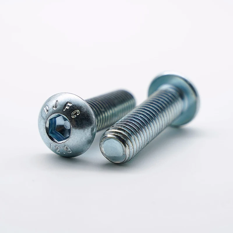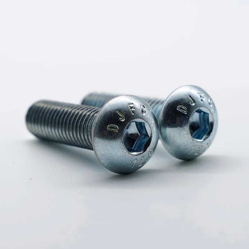 Proces cynkowania galwanicznego stosowany w ocynkowanych śrubach z łbem walcowym z gniazdem sześciokątnym ma na celu precyzyjną kontrolę osadzania warstwy cynku za pomocą prądu elektrycznego w niskiej temperaturze, aby zapewnić jednolitą powłokę i gładką powierzchnię. Ma minimalny wpływ na właściwości mechaniczne podłoża o wysokiej wytrzymałości gatunku 12.9, skutecznie zapobiegając ryzyku kruchości wodorowej. Nie zmienia wielkości obrabianego przedmiotu i szczególnie nadaje się do precyzyjnego montażu i późniejszych potrzeb malarskich. W porównaniu z cynkowaniem ogniowym, cynkowanie galwaniczne ma delikatniejszy wygląd, dokładniejszą kontrolę wymiarów i jest bardziej odpowiednie dla standardowych części klasy przemysłowej. Klasa 12.9 reprezentuje gatunek o bardzo wysokiej wytrzymałości, a jego ostateczna wytrzymałość na rozciąganie i granica plastyczności znacznie przewyższają wytrzymałość zwykłych śrub ze stali węglowej lub stali nierdzewnej. Jednocześnie zapewnia śrubom doskonałą odporność na rozciąganie, ścinanie i zmęczenie i szczególnie nadaje się do trudnych warunków pracy z dużymi obciążeniami, obciążeniami udarowymi lub ciągłymi wibracjami. Ma znaczące zalety w zastosowaniach wymagających dużego napięcia wstępnego, aby zapewnić niezawodność połączenia.