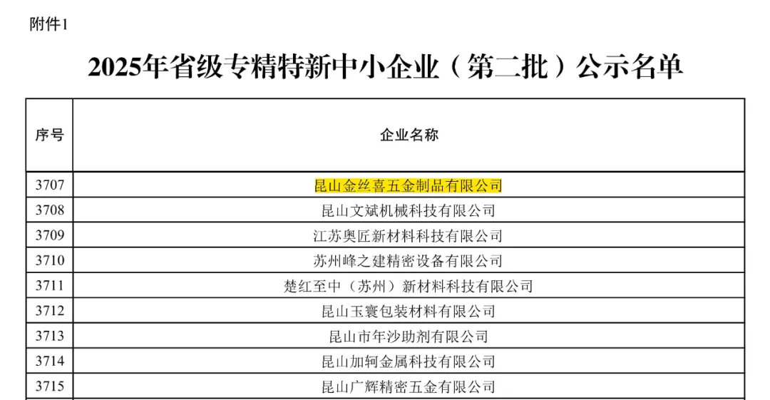 Slovenski Niedawno Departament Przemysłu i Technologii Informacyjnych prowincji Jiangsu oficjalnie ogłosił najnowszą partię wyspecjalizowanych i wyrafinowanych MŚP Jiangsu uznanych za rok 2025. Kunshan Jinsixi Metalware Co., Ltd. została pomyślnie wybrana i otrzymała tytuł „Wyspecjalizowanych i wyrafinowanych MŚP Jiangsu” ze względu na głęboką akumulację techniczną, doskonałą jakość produktów i ciągłe innowacje w podsektorze elementów złącznych.